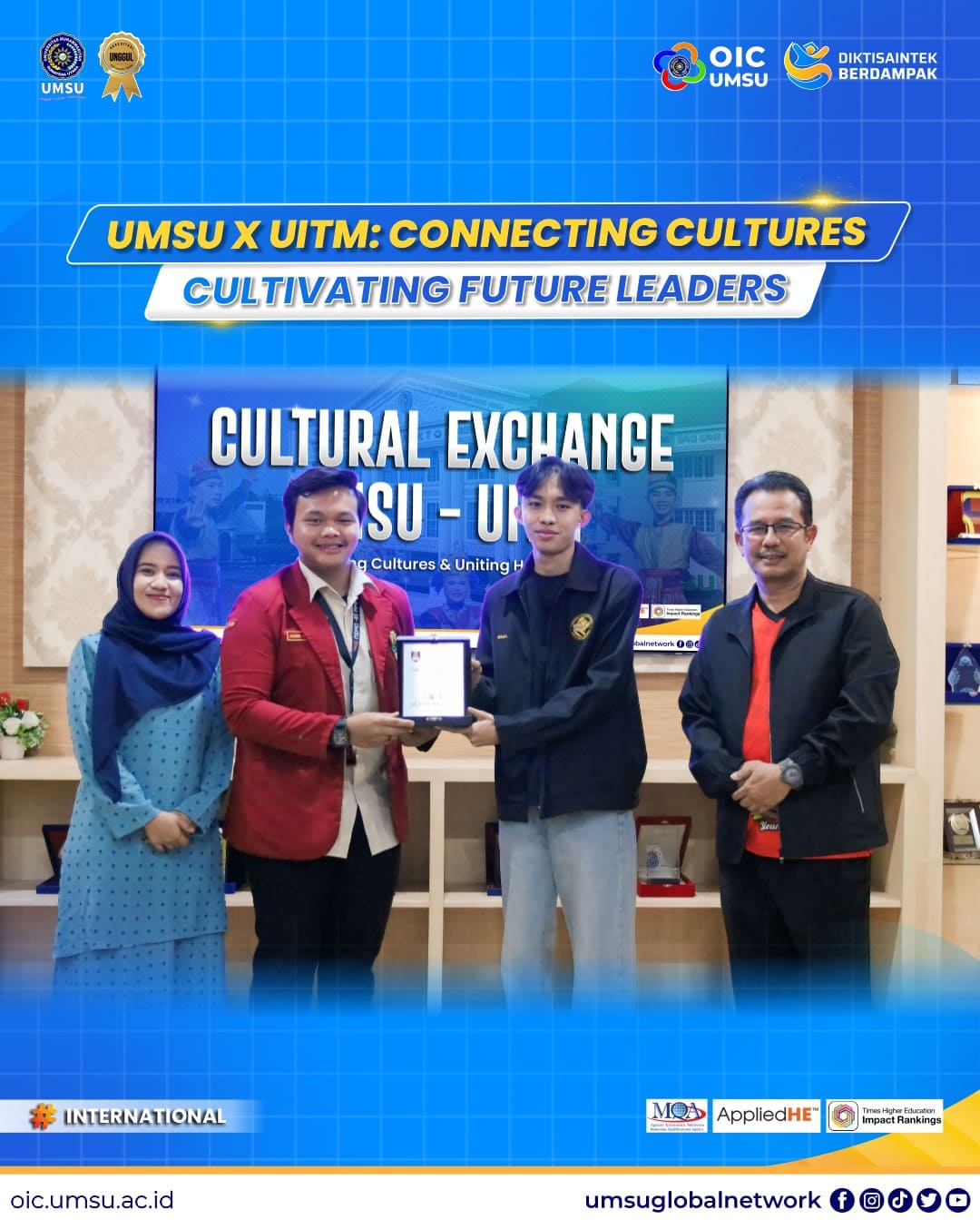 Universitas Muhammadiyah Sumatera Utara (UMSU) bersama Universiti Teknologi MARA (UITM) Malaysia sukses menggelar serangkaian kegiatan bertajuk “Cultural Exchange & International Talkshow 2025” dengan mengangkat tema “Bridging Cultures, Uniting Heritage” yang berarti Menjembatani Budaya, Menyatukan Warisan. Kegiatan ini bertujuan untuk mempererat hubungan antarbangsa melalui budaya serta membangun semangat kepemimpinan mahasiswa di era global.