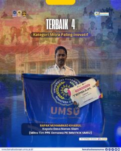 Tidak berhenti di sana, UMSU pun sukses meraih penghargaan Terbaik Kedua untuk Perencanaan Keberlanjutan Paling Terukur melalui Tim PATRIOT IKLIM HMJ Kesejahteraan Sosial FISIP UMSU, dan penghargaan Terbaik Kedua untuk Capaian Indikator Paling Komprehensif melalui Tim TERNAK PRENEUR HMJ Pendidikan Akuntansi FKIP UMSU. Adapun penghargaan keenam diperoleh pada kategori Mitra Paling Inovatif, yang diberikan kepada Muhammad Khairul, Kepala Desa Nenas Siam sebagai mitra program PK IMM FKIK UMSU — sebuah pengakuan bahwa kolaborasi mahasiswa bersama masyarakat berjalan efektif dan menciptakan kemajuan bersama.