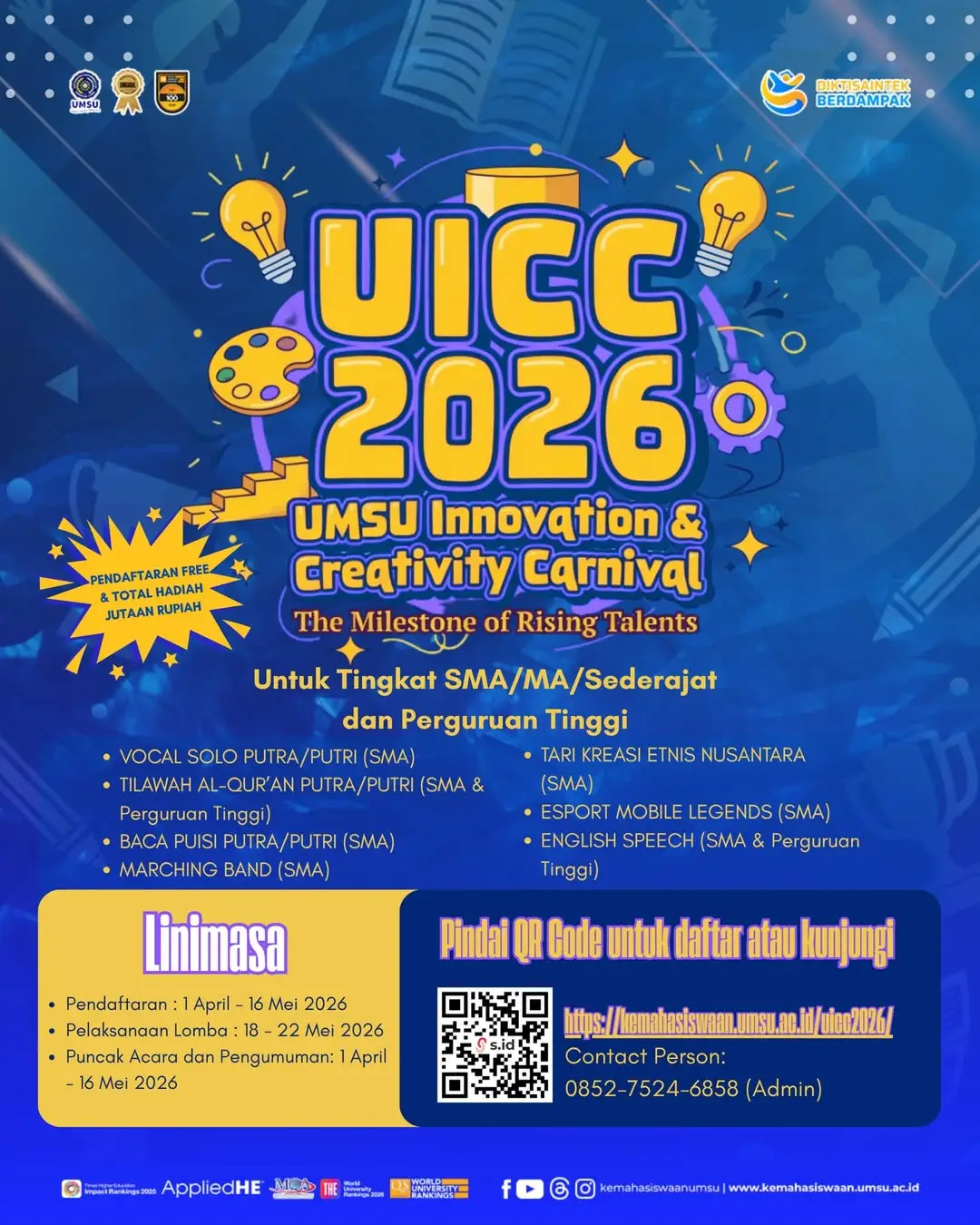 Universitas Muhammadiyah Sumatera Utara (UMSU) kembali menghadirkan ajang kompetisi kreatif bagi generasi muda melalui UMSU Innovation & Creativity Carnival (UICC) 2026. Kegiatan ini menjadi wadah bagi pelajar SMA/MA/sederajat dan mahasiswa untuk menampilkan bakat, kreativitas, serta kemampuan mereka di berbagai bidang lomba.